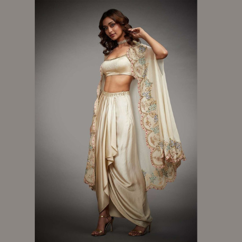 - Add statement fusion pieces like cape gowns or pre-stitched sarees.