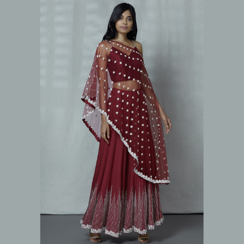 - A lehenga design paired with an off-shoulder blouse.