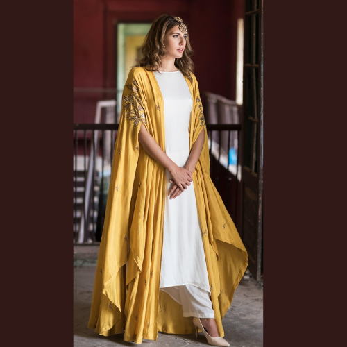 A lightweight kurti with palazzo pants and a flowy cape gives a regal yet modern vibe. This style is perfect for office parties, festive evenings, or even destination weddings.
