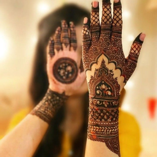 Now comes our all-time classic Indian mehndi design. This one is usually super detailed and fill-up-the-whole-hand types. You’ll see flowers, mango shapes, mandalas, elephants, kalash – all cultural elements. It’s mostly used in weddings and religious events.