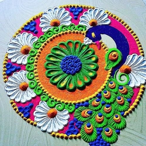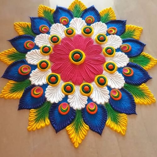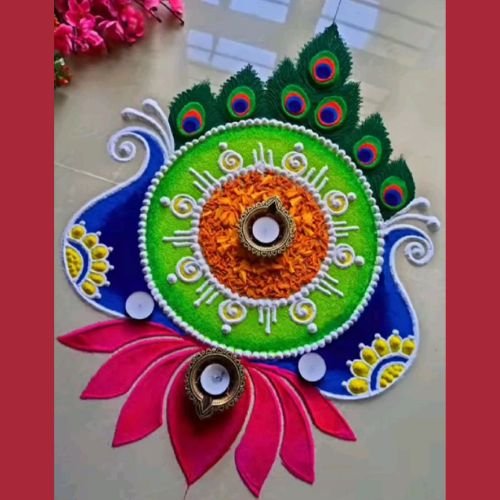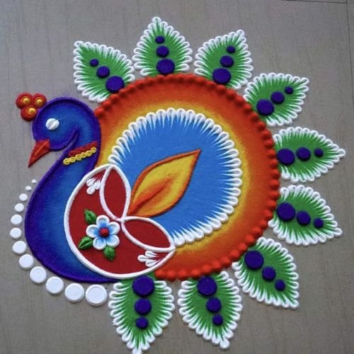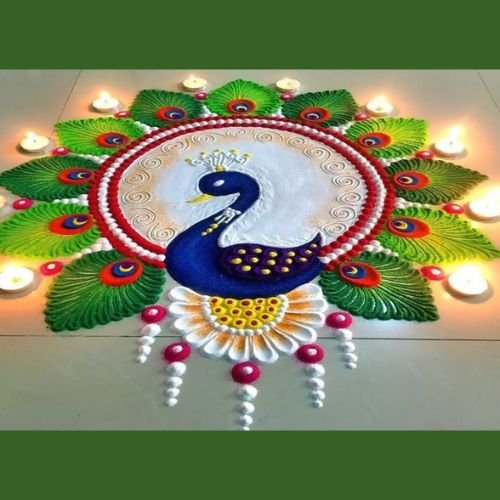 A symbol of beauty and grace, peacock rangolis are a Diwali favorite. Opt for detailed feathers and glitter outlines.