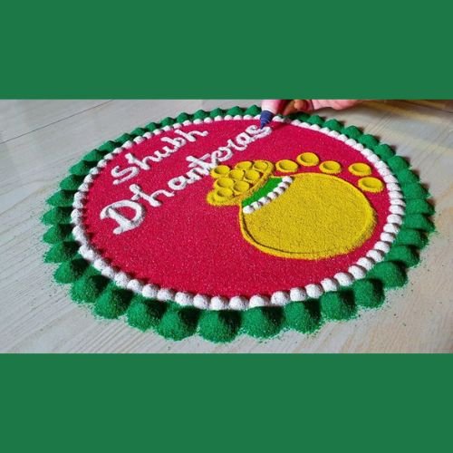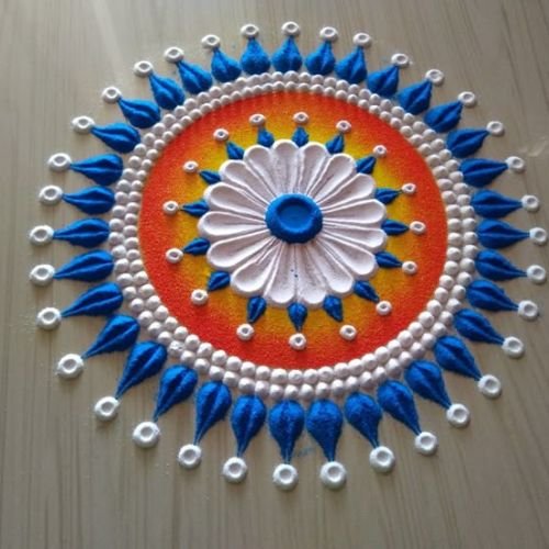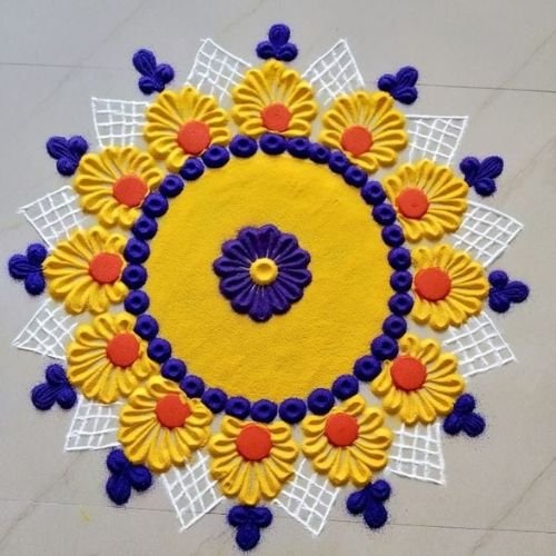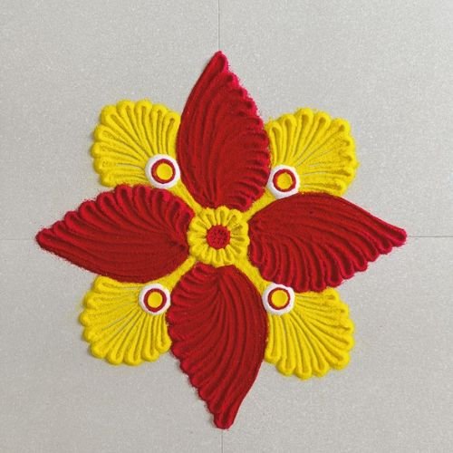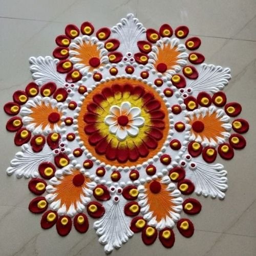 To avoid a messy or overloaded design, start with 3–4 contrasting colours. It keeps the rangoli neat, balanced, and easier to manage, especially if you’re short on time.