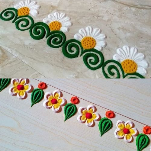 These feature sharp lines, mandalas, and 3D effects—ideal for a contemporary home. Use stencils and vibrant rangoli powders.
