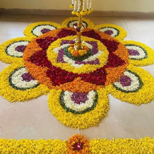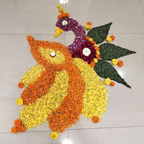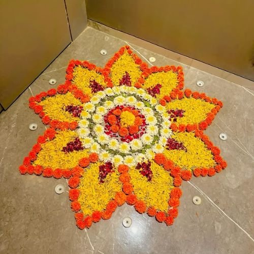 Fresh petals of marigold, rose, and jasmine create a natural and fragrant rangoli. Perfect for pooja setups and outdoor corners.