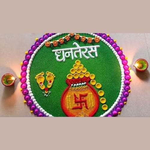 Focus on coins, kalash, and diyas to symbolize wealth and blessings. Use golden hues and metallic powders for shine.