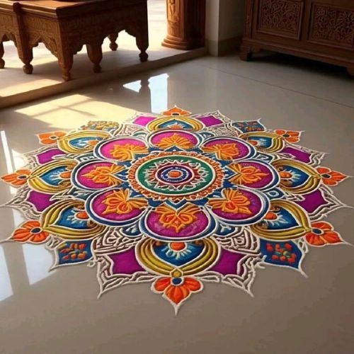 Rangoli is a traditional Indian art form created using coloured powders, flower petals, rice, or sand, designed on the floor to celebrate festivals and special occasions—especially Diwali. Rooted in Indian culture, rangoli is not just decorative but also symbolic. It is believed to bring good luck, positive energy, and prosperity into the home.
