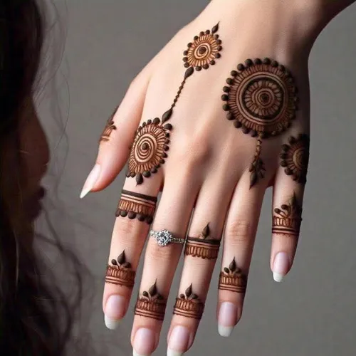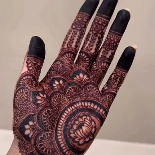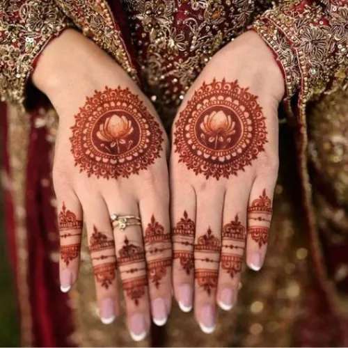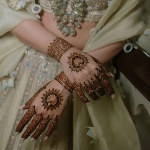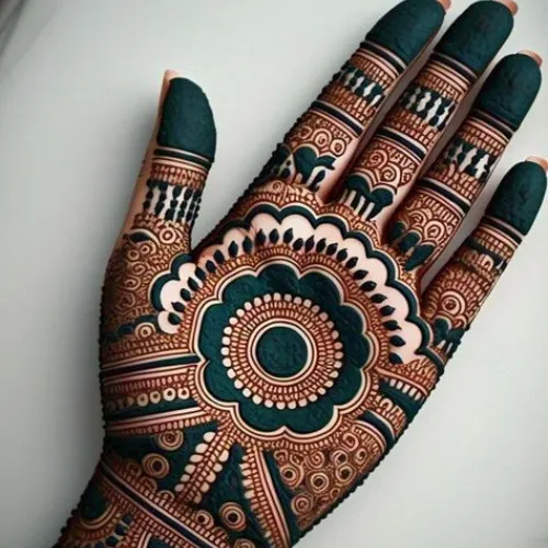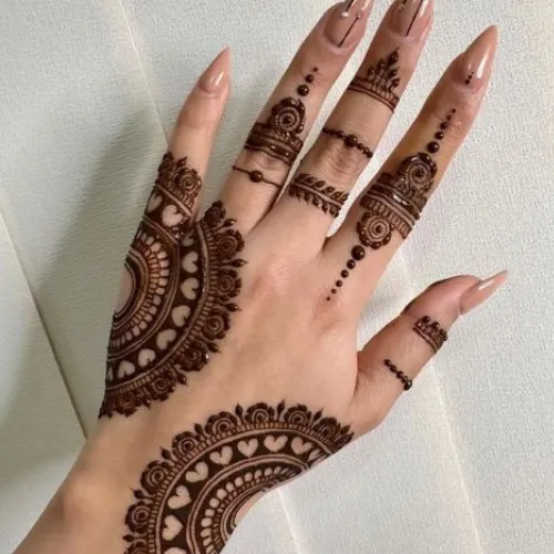 2. Royal Mandala Design: Start with a big mandala in the center of your palm, and then add fine lines and patterns around. The fingers can have matching designs too.