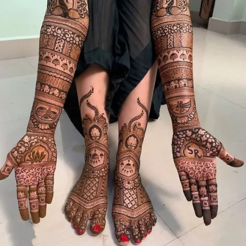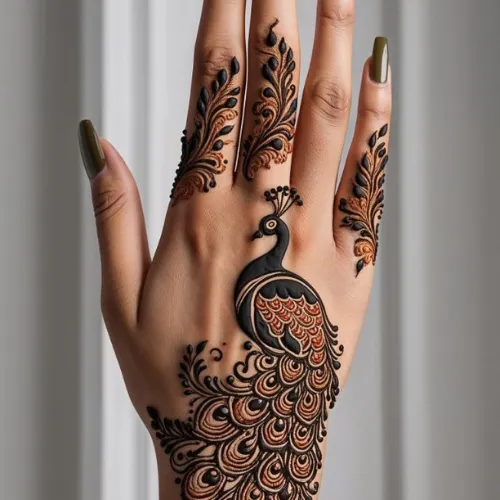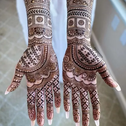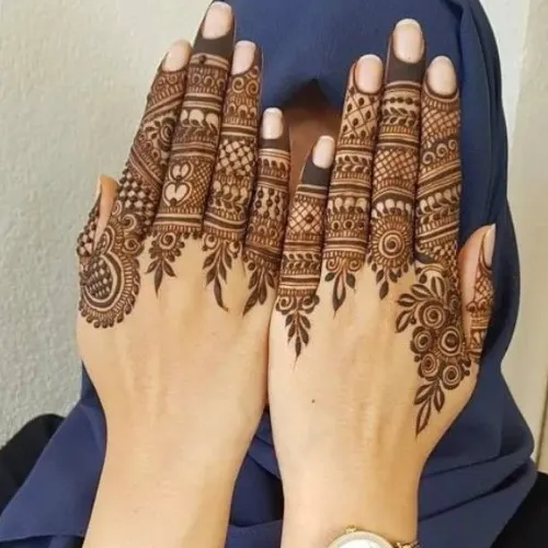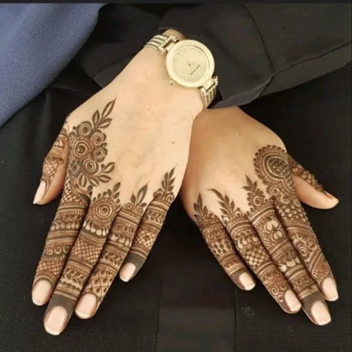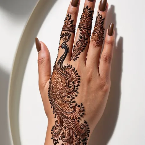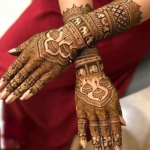 Full hand covered with lots of details like peacocks, flowers, and fine work.
